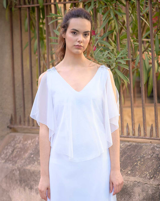 • Capa de fiesta con tela de gasa en color blanco, perfecto para taparte en tus ocasiones especiales y estar igual de elegante.