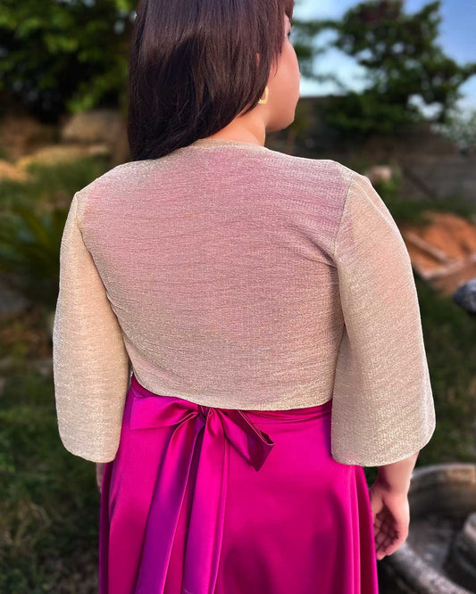 Boleros Elegantes: Ideales para combinar con vestidos de día o vestidos elegantes cortos, los boleros aportan un toque chic y funcional. Son perfectos para complementar con vestidos de cualquier color, ya sea buganvilla o azul eléctrico o un vestido de manga larga, ofreciendo versatilidad y estilo.