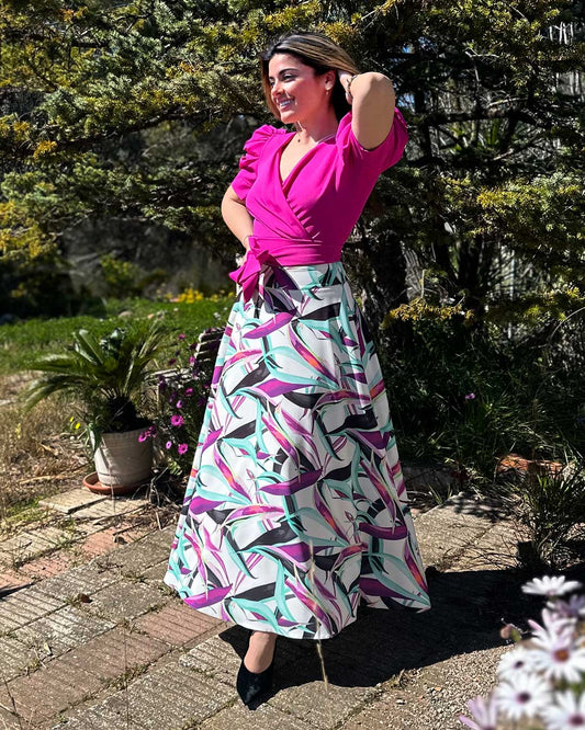 Falda plisada plumas bugambilia