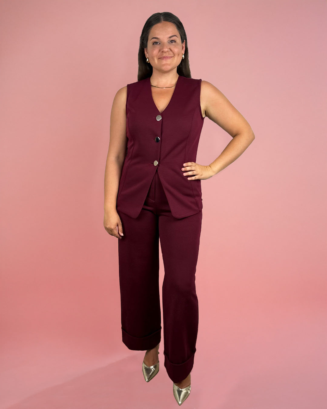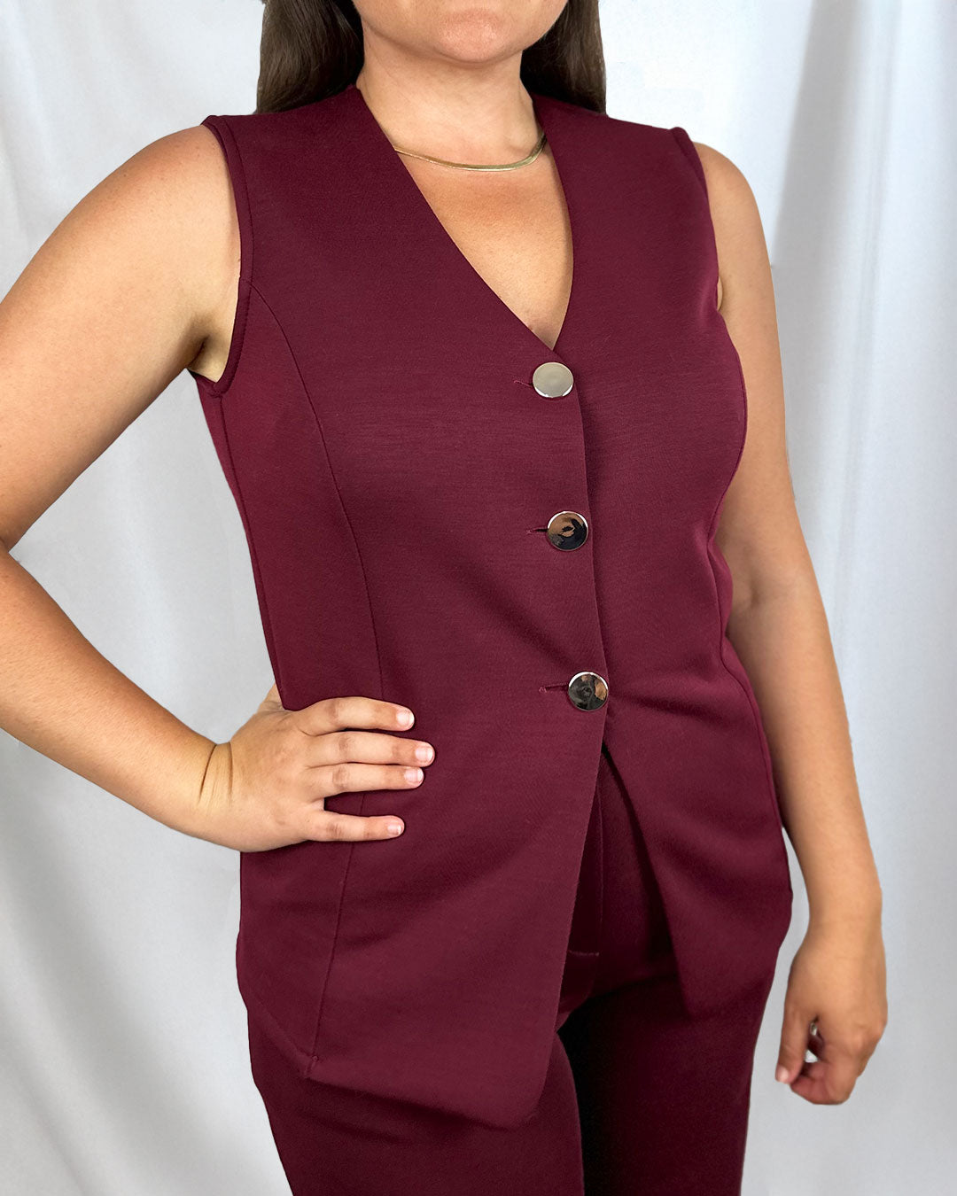 Este chaleco es de esas piezas que transforman cualquier look ✨. Está confeccionado en una tela gruesa y elástica que recuerda al neopreno suave: se adapta de maravilla, no pesa y no se arruga. Su diseño entallado con botones dorados aporta un aire elegante y moderno, ideal para combinar con el pantalón a juego que ves en las fotos.